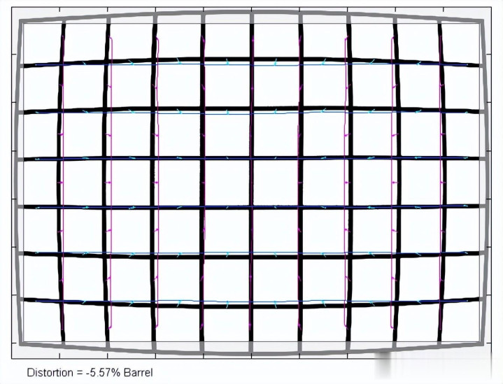 厂商在镜头设计时需平衡多项参数,富士为了追求更紧凑的机身,往往会在一定程度上容忍畸变。这一点在8mm f/3.5 上也体现得十分明显:RAW格式下,桶形畸变率超过5.5%,如此严重的畸变使得未校正的原始画面基本无法使用。